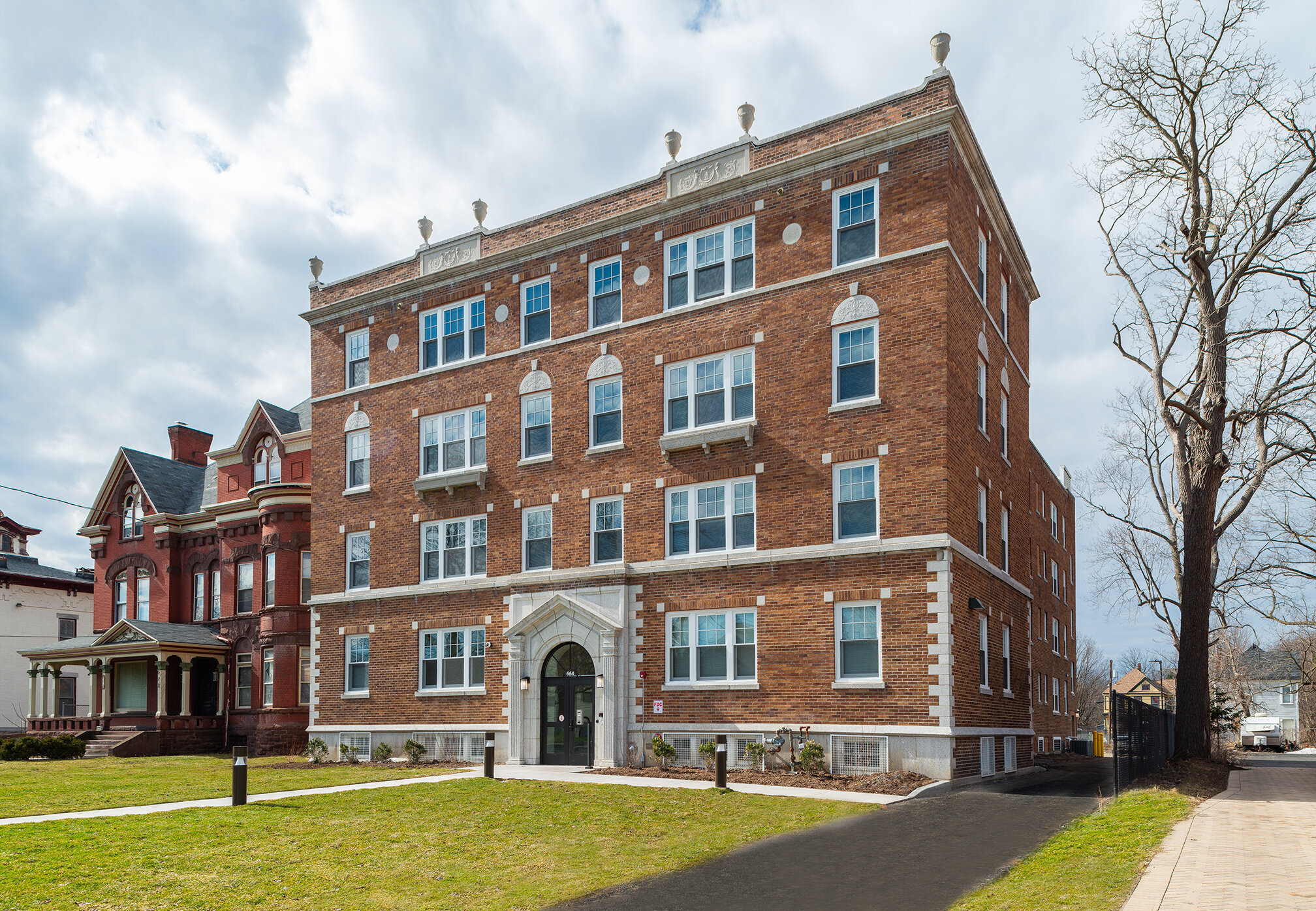 Built around 1926, the Sagamore’s residents were among the rising middle and upper class of Syracuse. A victim of urban renewal and white flight, the Sagamore started to decline in the 1970s. By the 1980s, this decline had taken full effect. The building was eventually abandoned and fell into significant disrepair over the course of two decades of vacancy. Portions of the interior were severely deteriorated due to roof leaks and fire damage. Thankfully, the exterior of the building remained structurally sound even as such a large portion of the interior had not. Despite the significant damage, Housing Visions made sure to respect the building’s historic features while modernizing and designing for sustainability whenever possible. Details like the mosaic tile border in the hallway and decorative cast stone panels on the exterior were preserved. That attention to detail paid off when the building was listed on the National Register of Historic Places in 2017.